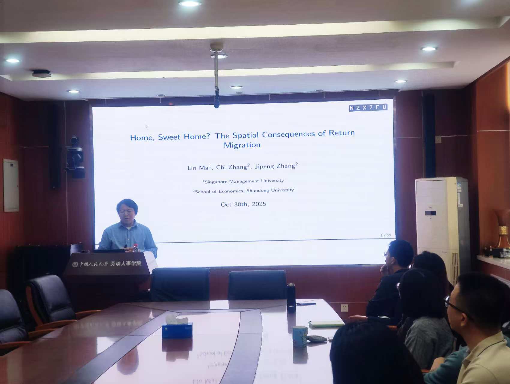 2025年11月5日下午,由日本成人电影 主办,劳动经济系和中国就业研究所承办的“劳动经济学双周论坛”第225期讲座在求是楼347会议室成功举办。来自山东大学的张吉鹏教授分享了主题为“Home, Sweet Home? The Spatial Consequences of Return Migration”的研究。本次论坛由日本成人电影 邹先强副教授主持,日本成人电影 赵丽秋教授、刘宏教授、翁茜副教授、林琳讲师、王雪凝讲师、雷子腾讲师、陈泽阳讲师、黄础令讲师以及其他校内外师生参与了此次讲座。